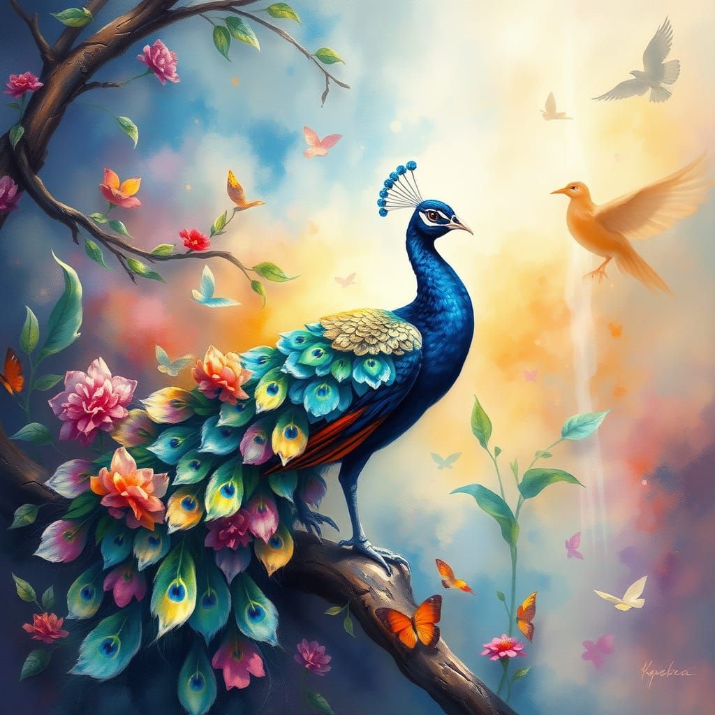 This enchanting watercolor painting depicts a majestic peacock in a whimsical, dreamlike setting, characterized by vivid colors and delicate brushstrokes reminiscent of the romantic style of an idealized fantasy world.