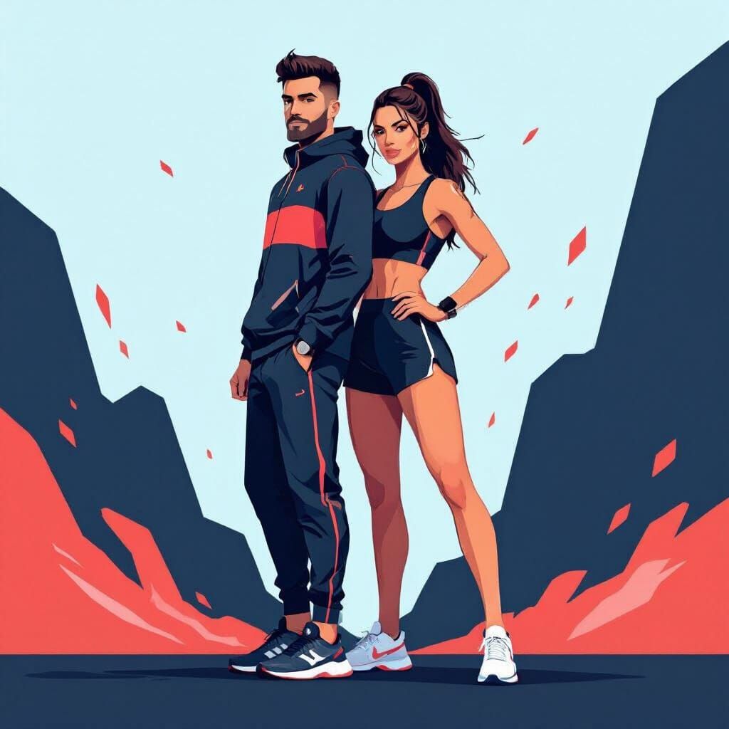 This image shows an athletic male and female couple in trendy sportswear and sneakers, posing dynamically. A stylized realism rendering with clean lines and contrasting colors makes it ideal for a web banner.