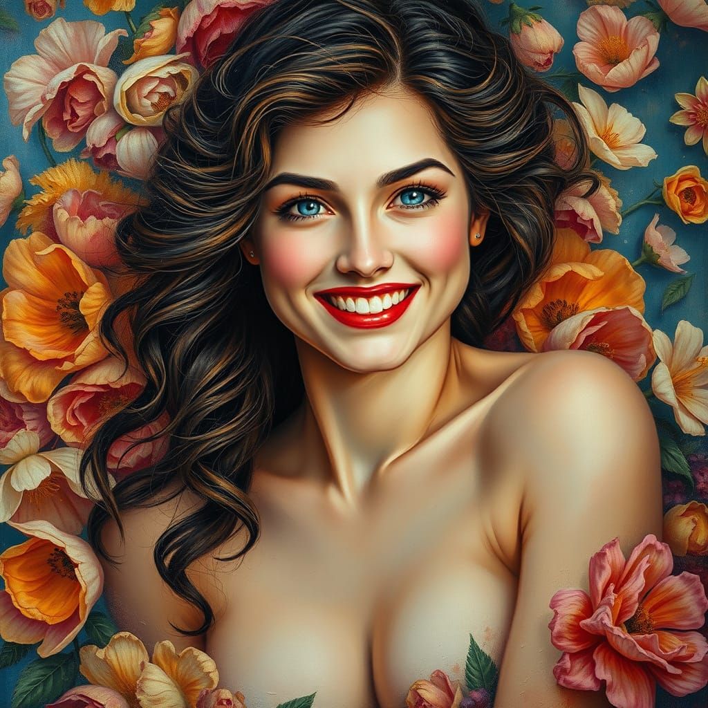 This image shows Venus emerging from a tornado of flowers, her blue eyes sparkling with joy. The neo-impressionistic image, reminiscent of oil paintings, uses impasto acrylic techniques and thick layers of colorful textured paint.