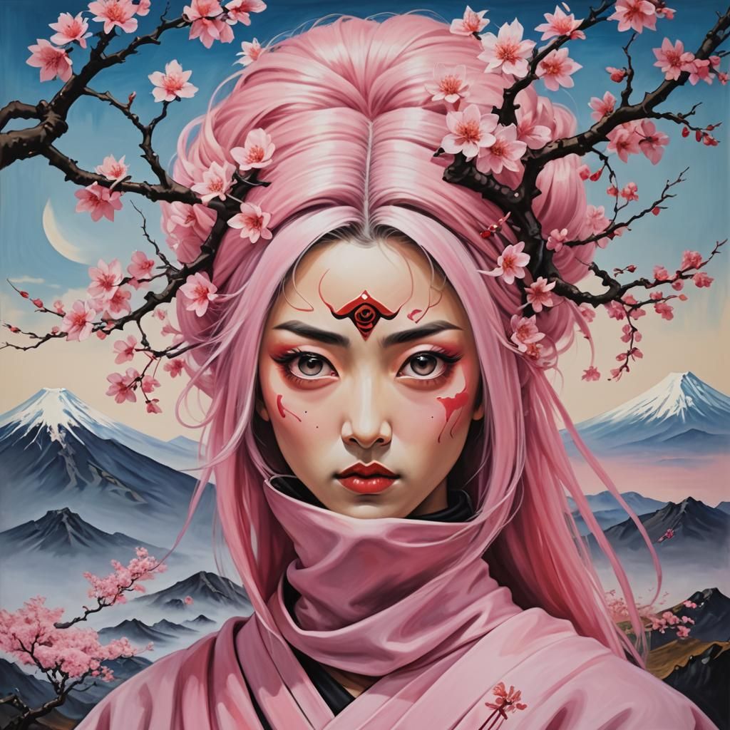 A surreal oil on canvas painting of a female ninja with large eyes standing before Mount Fuji. The artwork features a matte background and melting elements in a surrealist style.