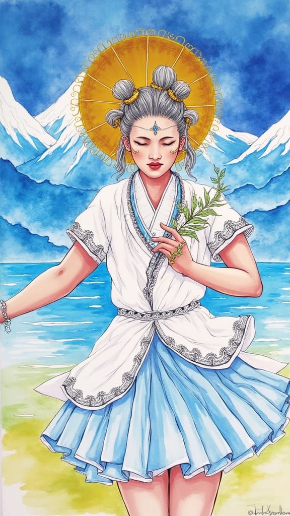 This image shows a serene figure in Tibetan clothing, set against misty mountains. The image is rendered as a dramatic watercolor painting with expressive brushstrokes.