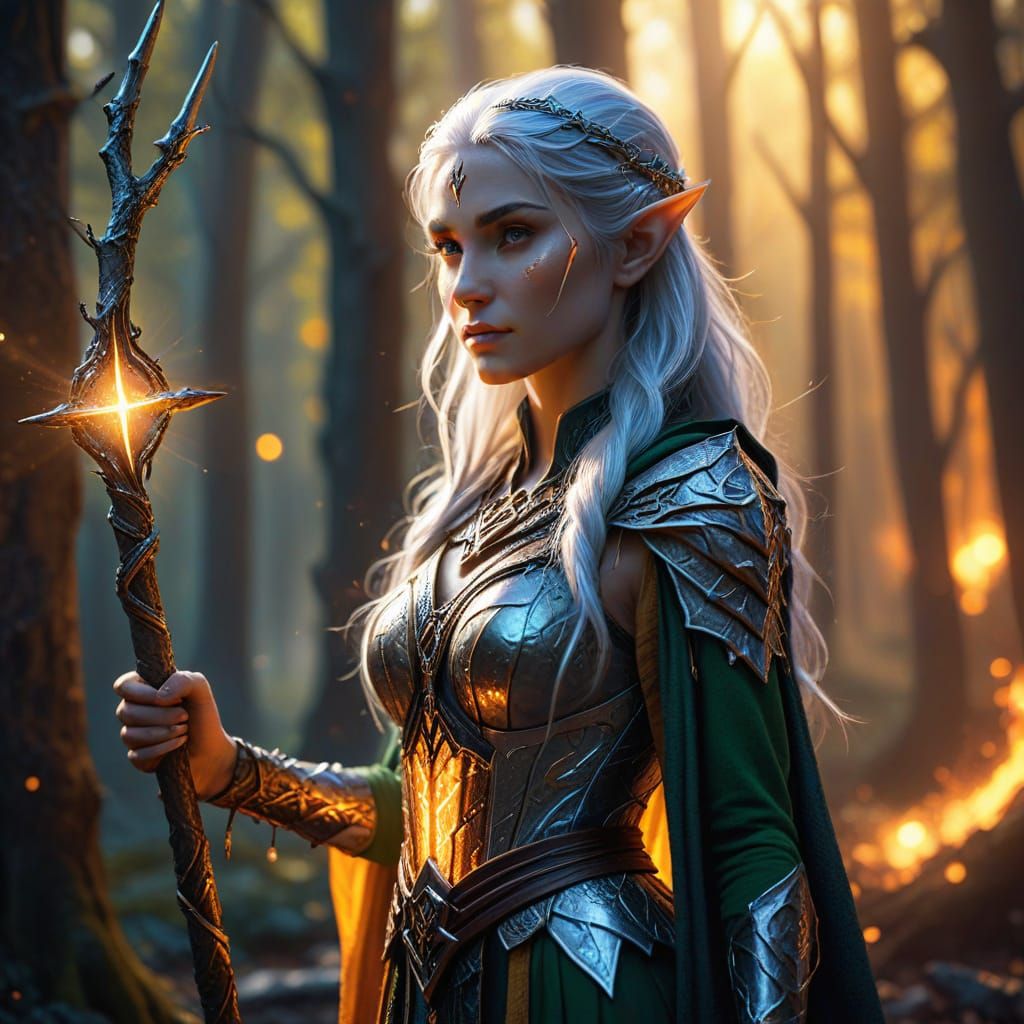 A cinematic fantasy scene of a female elf in a glowing forest at sunset. She holds a rune staff, her silver hair flowing in the warm light. The art is vividly painted with deep shadows.