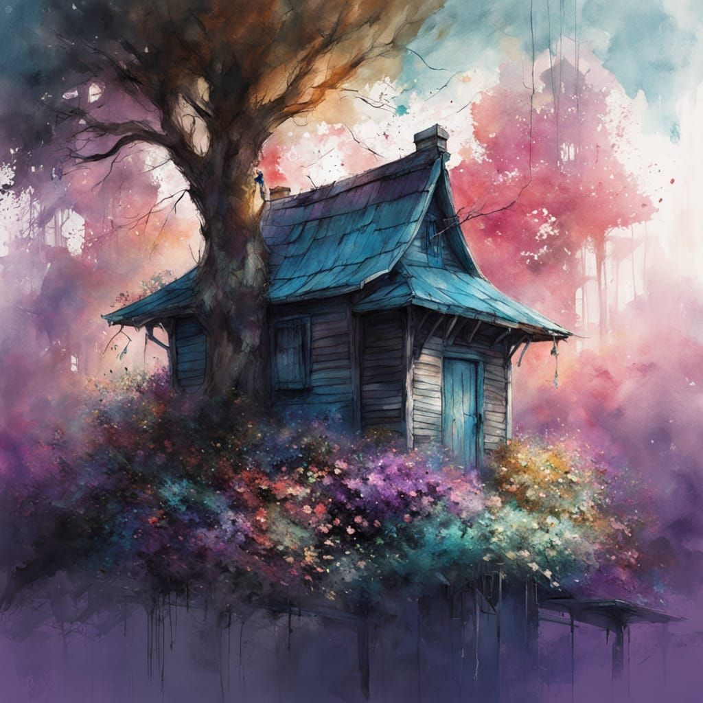 A vibrant watercolor painting of a birdhouse nestled in a tree, complete with colorful flowers and a bird in hues of teal, pink, and purple. The artwork is reminiscent of classic impressionist paintings.
