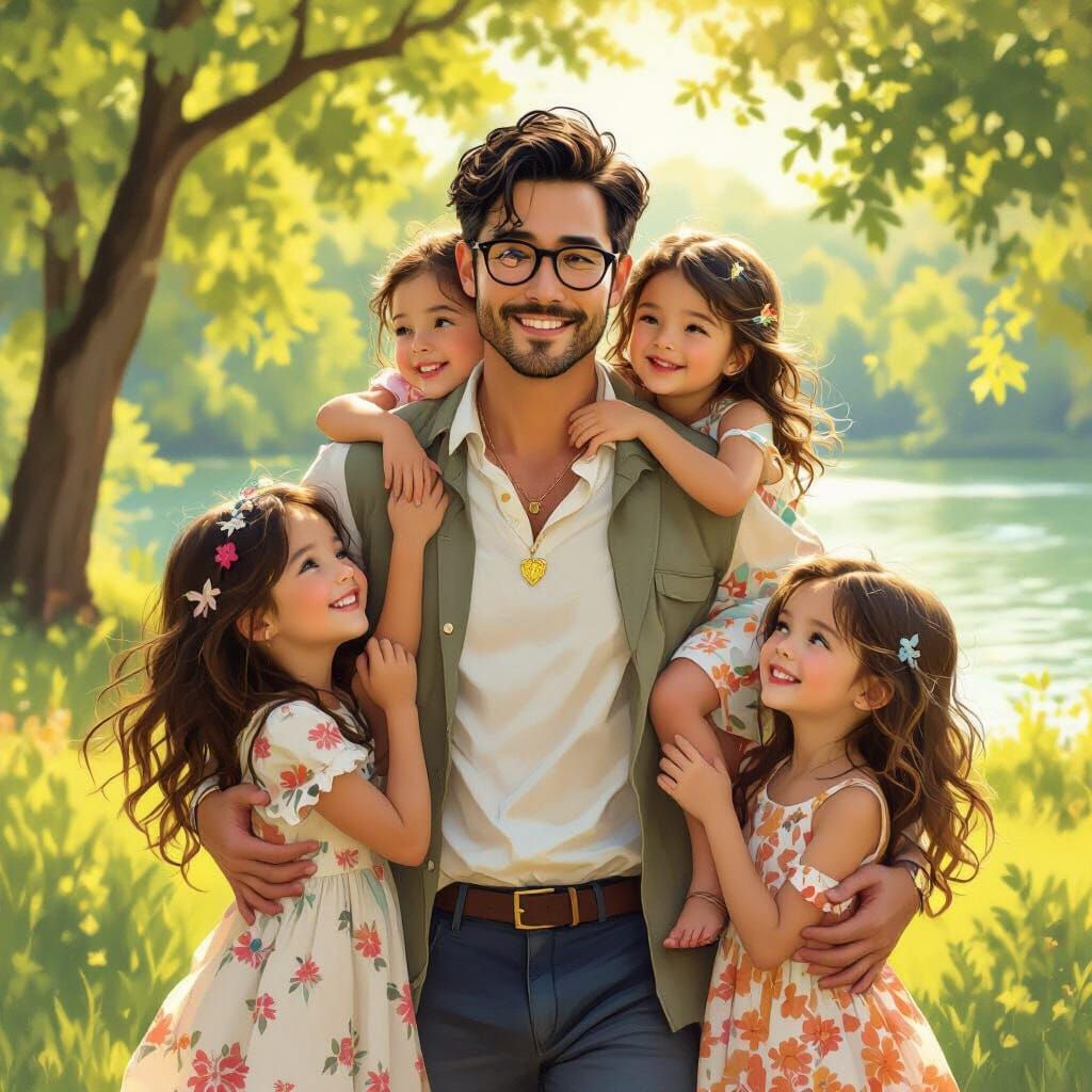 This image shows a father walking in a park with his three daughters. The artwork has an impressionistic style, with textured brushstrokes and a color palette dominated by golden hues.