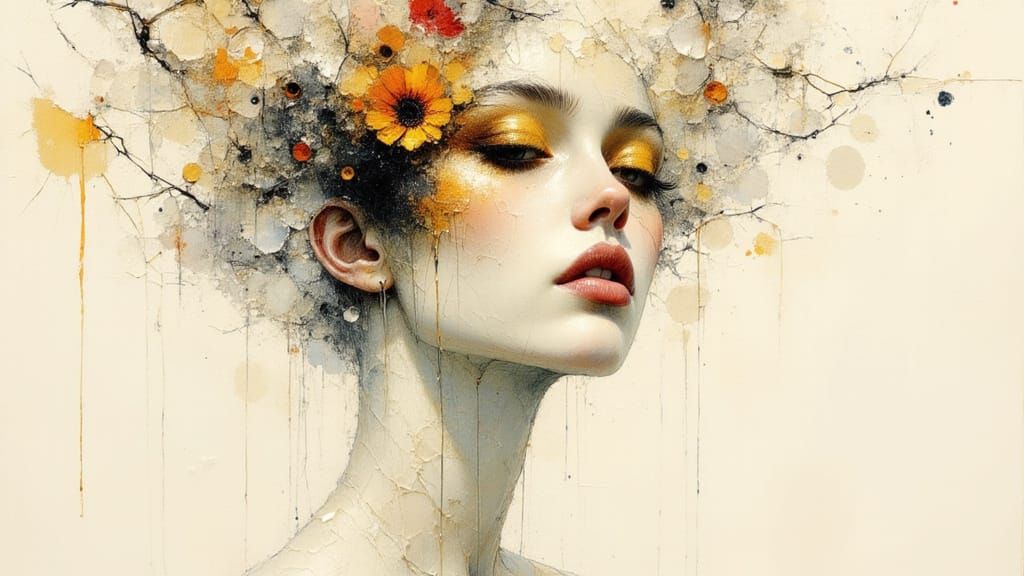 This image features a delicate, dreamlike woman surrounded by soft brushstrokes and delicate ink lines, suspended in a weightless world with subtle watercolor textures and expressive ink flourishes, reminiscent of surrealist abstractions and mystical landscapes.