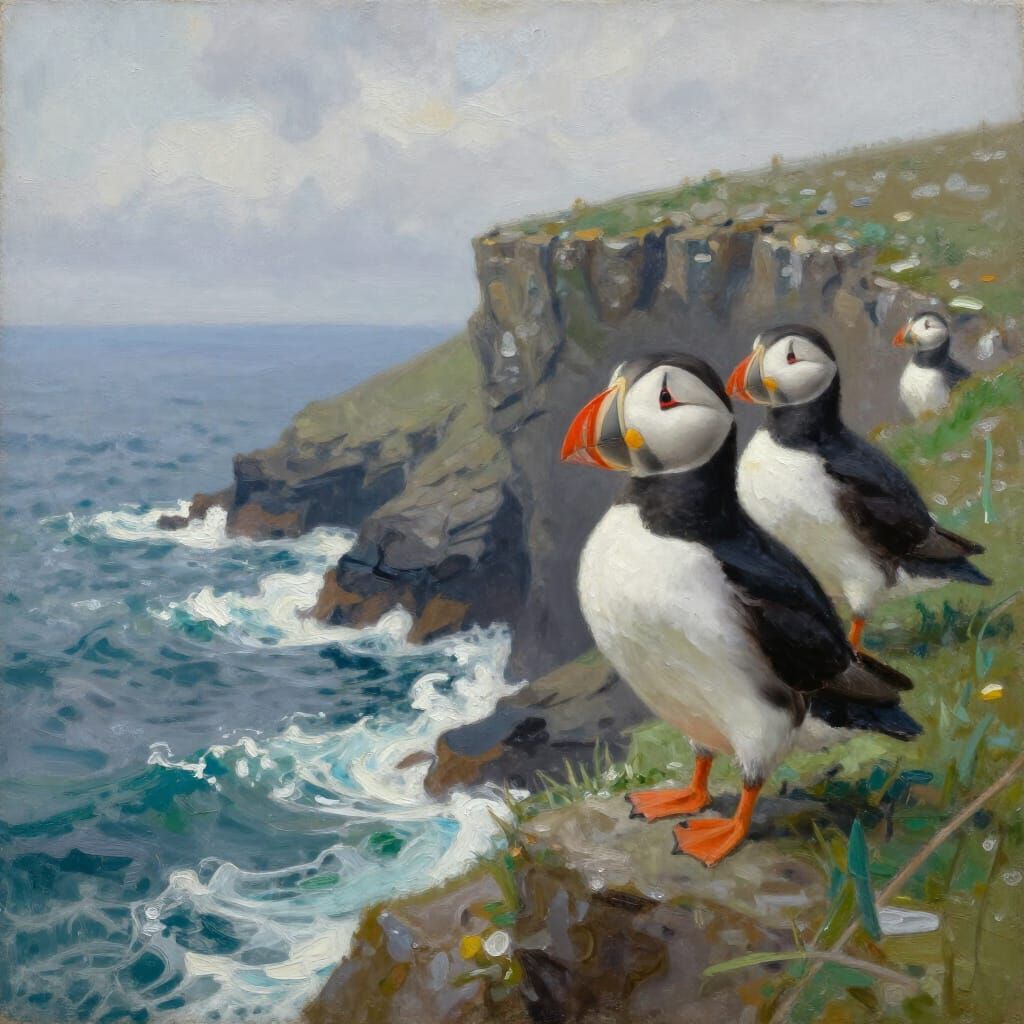 This image shows charming puffins on dramatic coastal cliffs of the British Isles, with a turbulent ocean below. Rendered as a textured oil painting with expressive brushwork.