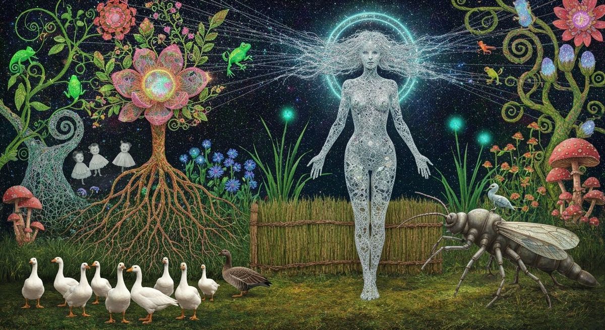 A woman with stardust in her hair stands in a surreal garden with cosmic flowers. Her form blends with bioluminescent plants in a psychedelic, eco-art style.