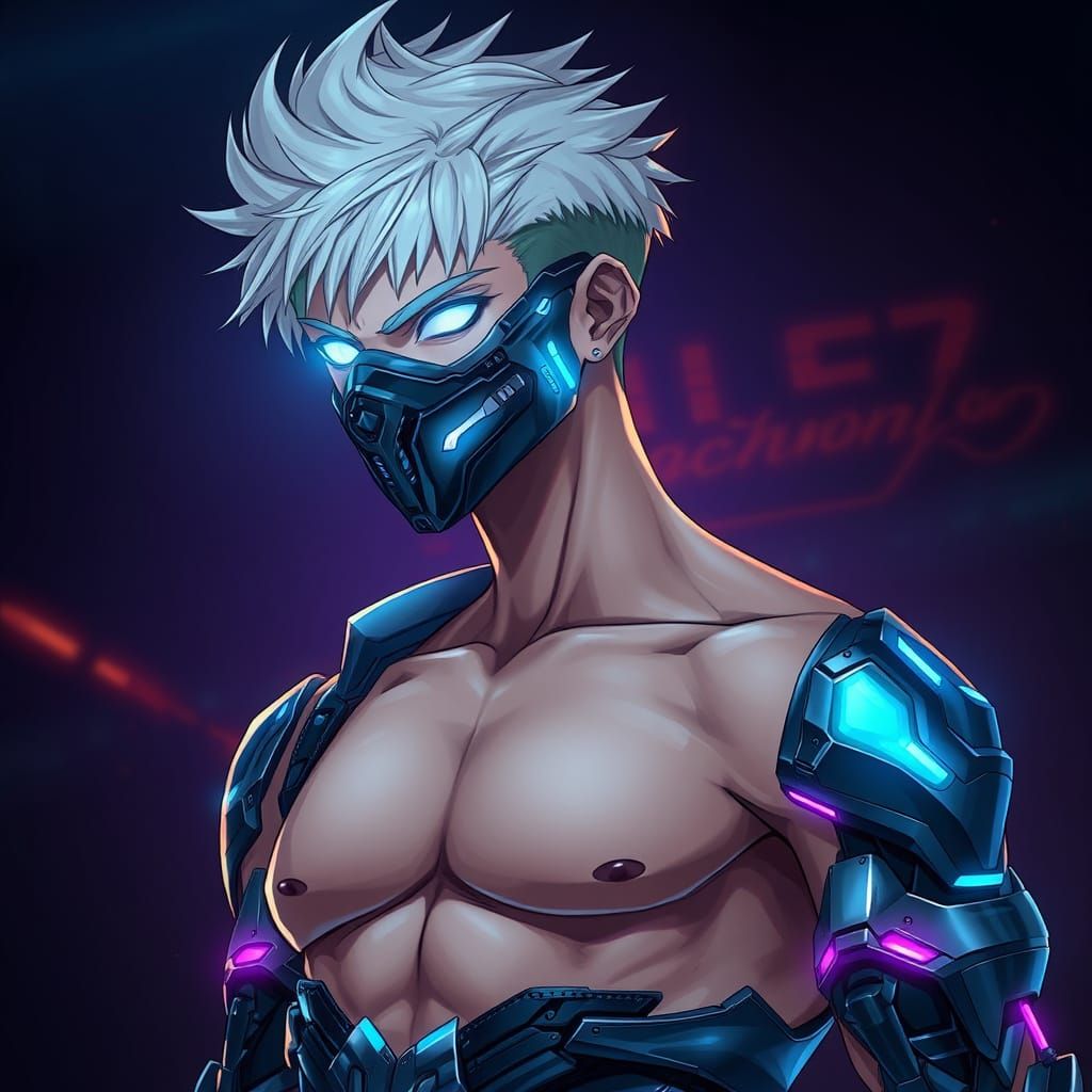 This image depicts a young cybernetic warrior with striking white hair and glowing cybernetic eyes, adorned with metallic cybernetic clothing and a high-tech cyber arm. Inspired by Anime and Manga styles, the artwork features vibrant colors and bold lines, with a dramatic atmosphere and dark background.