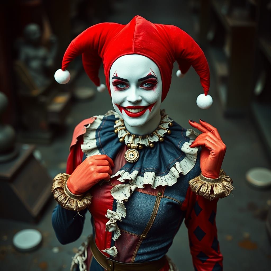 A vivid portrait of Harley Quinn in a jester costume, set in a 1930s-style dystopian world. The image blends bold color film photography with mythical and symbolist elements.