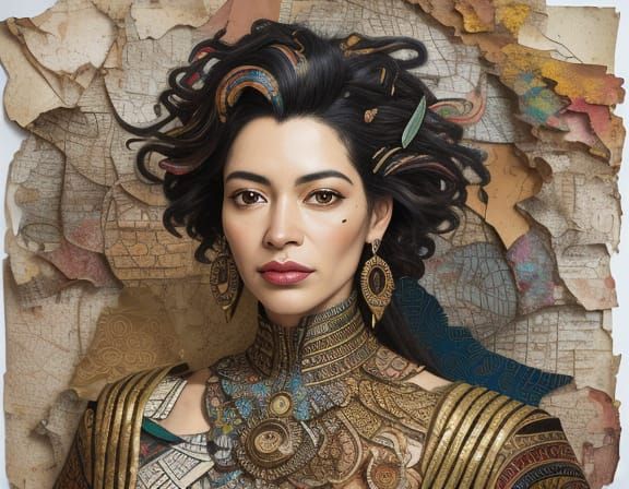 This image showcases a close-up portrait of an elegant lady surrounded by intricate, layered elements of maps, architectural plans, and cultural symbols. The artwork features vibrant, textured composition with energetic brushstrokes, collaged paper, and metallic accents, radiating a warm, golden light wi...