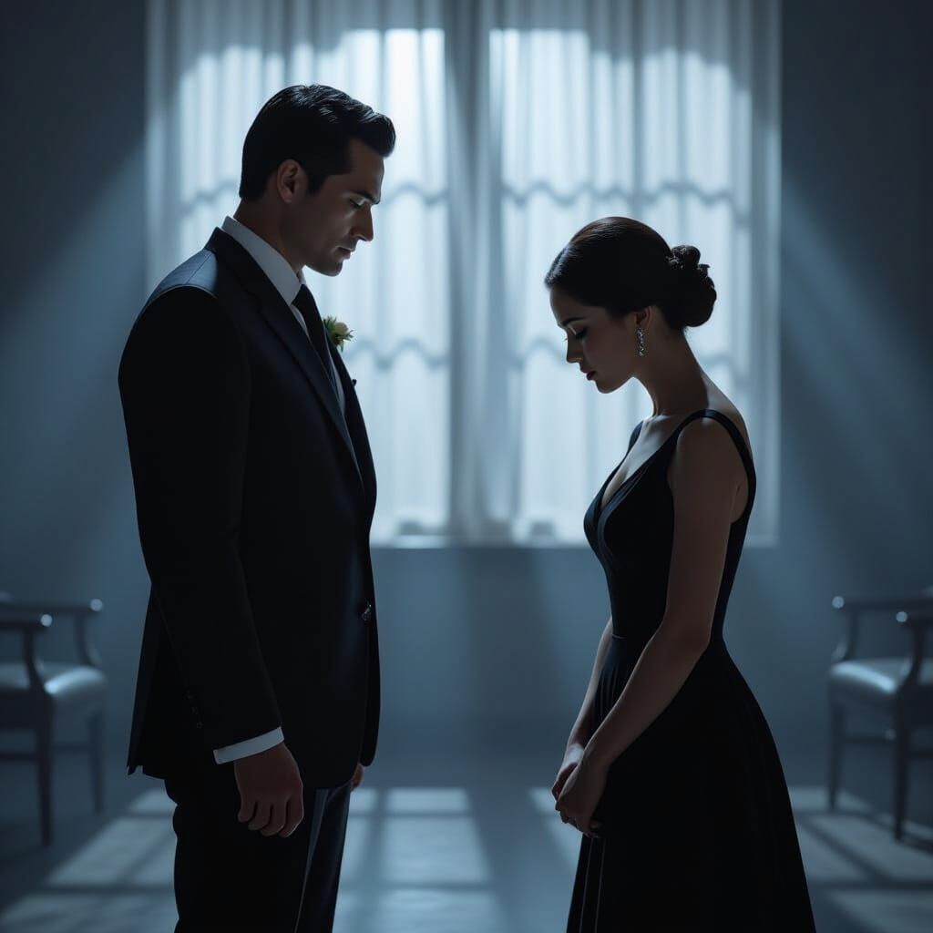A striking picture of a man reminding a woman of her past. The scene, reminiscent of film noir, features dramatic lighting and expressive characterizations in a dimly lit room.