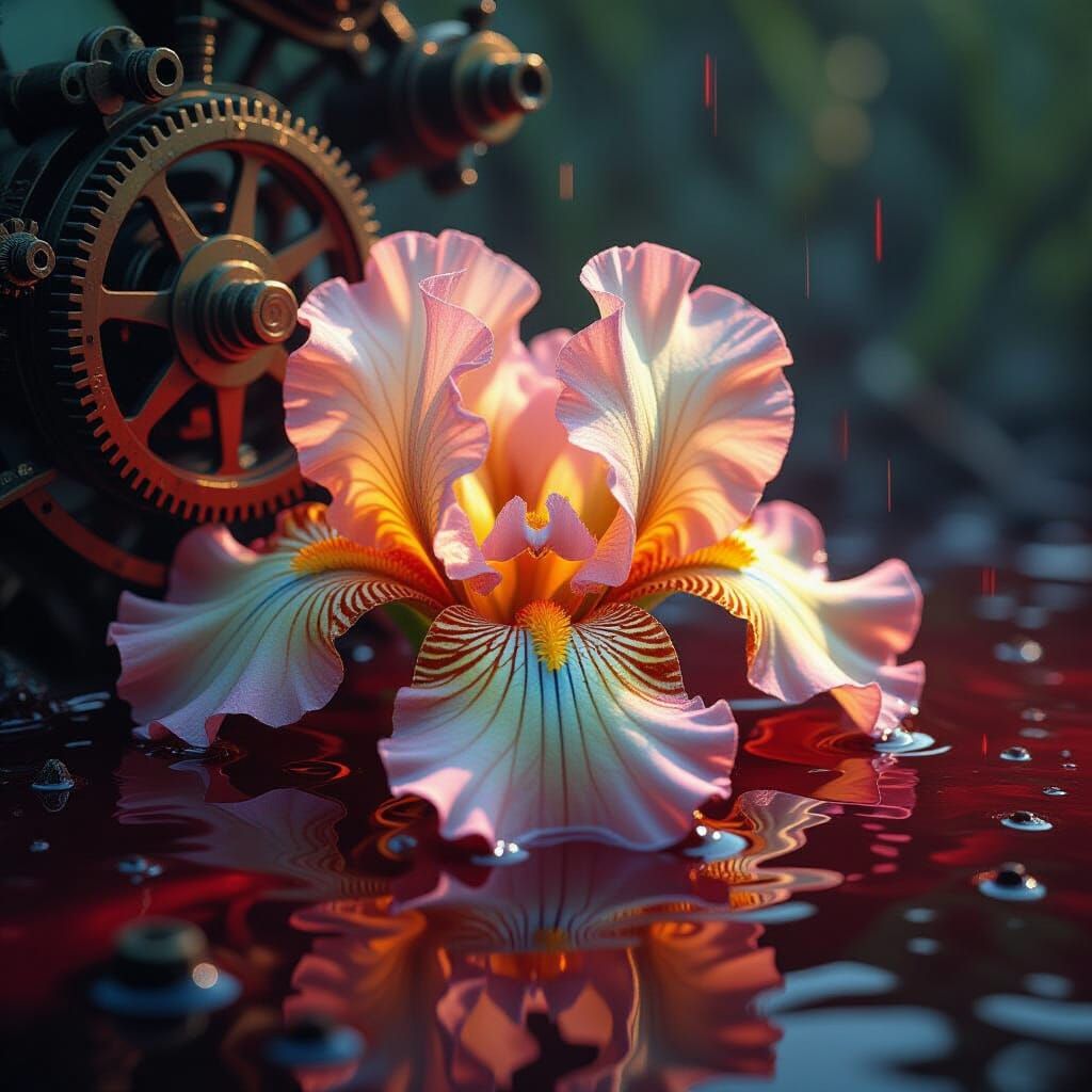 A striking picture of an opal iris submerged in red liquid, showcasing intricate steampunk engine details. The image is presented with film grain, a subtle vignette, and dramatic color grading, creating a cinematic, atmospheric effect as 35mm film photography.