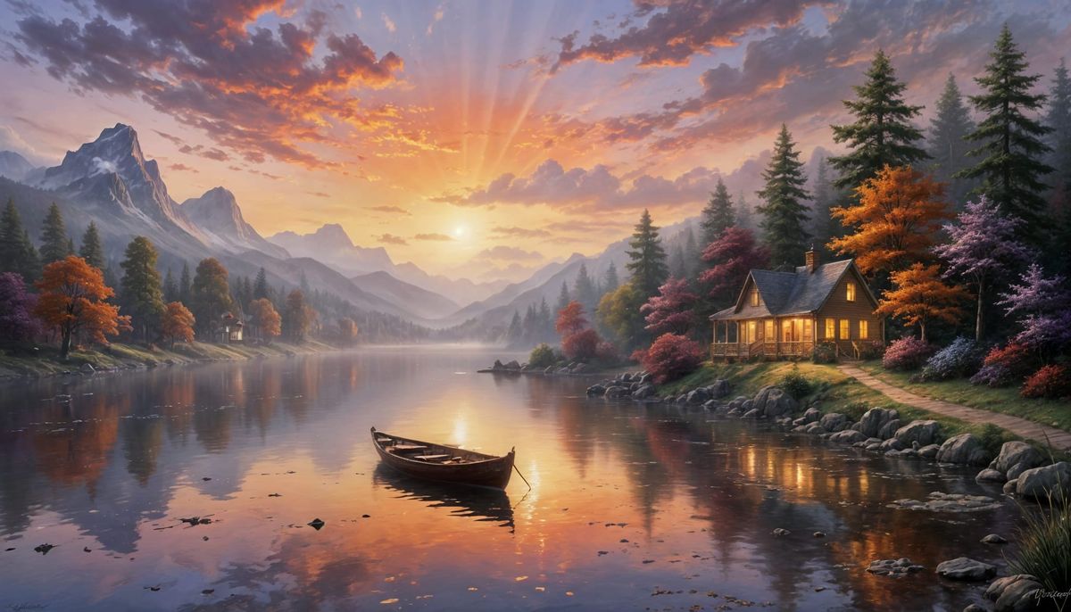 A vivid oil painting captures a tranquil lake mirroring a colorful sunset. A small wooden boat floats peacefully on the water. The scene evokes a romantic and ethereal atmosphere.