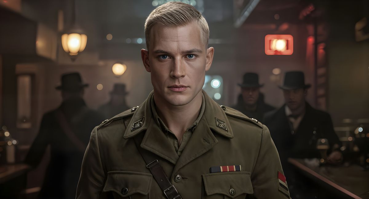 This image shows a handsome WWI soldier in olive uniform walking through a steampunk bar filled with criminals. The scene is rendered with cinematic lighting and strong atmospheric effects.