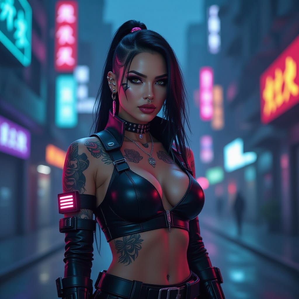 A striking picture of a confident woman with tattoos and vibrant makeup in a cyberpunk aesthetic. She is wearing futuristic clothing with glowing accents against a neon cityscape, with cinematic lighting.