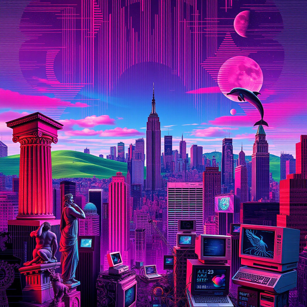 A chaotic blend of classical statues and 80s tech against a warped cityscape. This vibrant digital artwork evokes vaporwave nostalgia with glitch art and neon colors, reminiscent of digital decay.