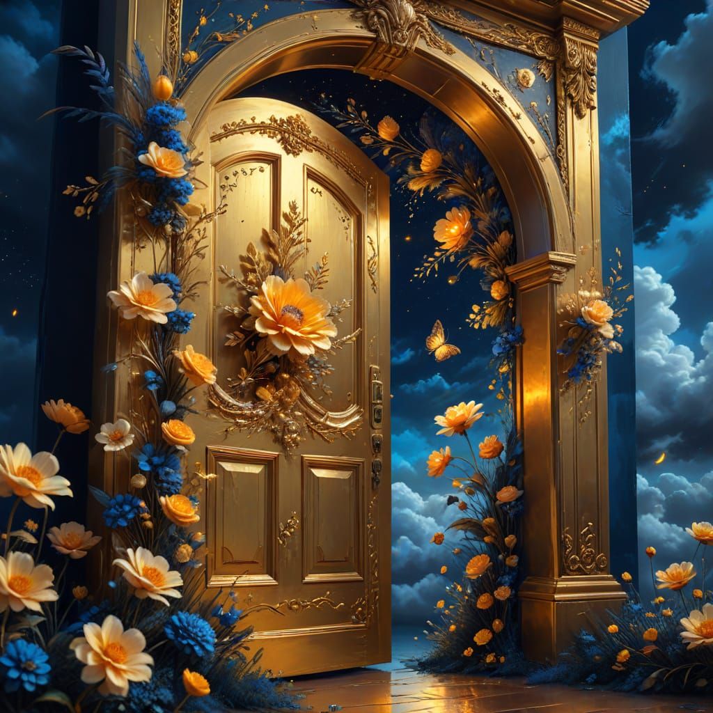 A striking picture of a golden door adorned with flowers, floating in a serene night sky. This vibrant oil painting employs triadic colors and glowing light to evoke a dreamlike fantasy.