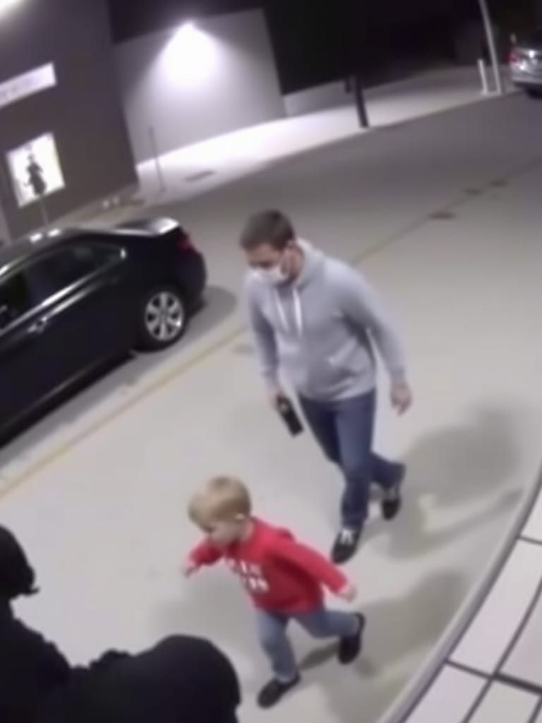 This image depicts a surreal scene of toddler-like figures being apprehended by police, captured from a body camera perspective. The style is reminiscent of gritty crime drama.
