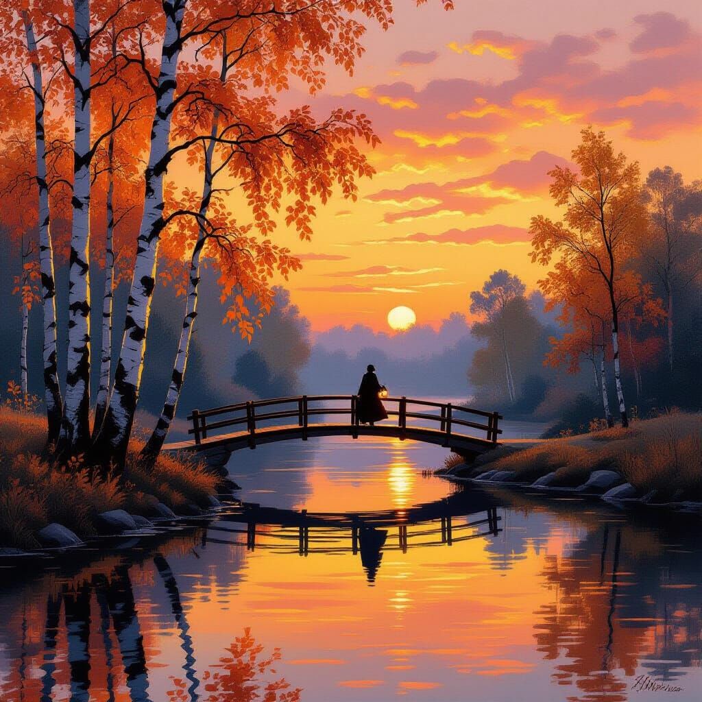 A tranquil waterside scene at twilight featuring vibrant autumn foliage reflected in the still water. This image evokes the style of classic landscape painting, with careful attention to light and detail.