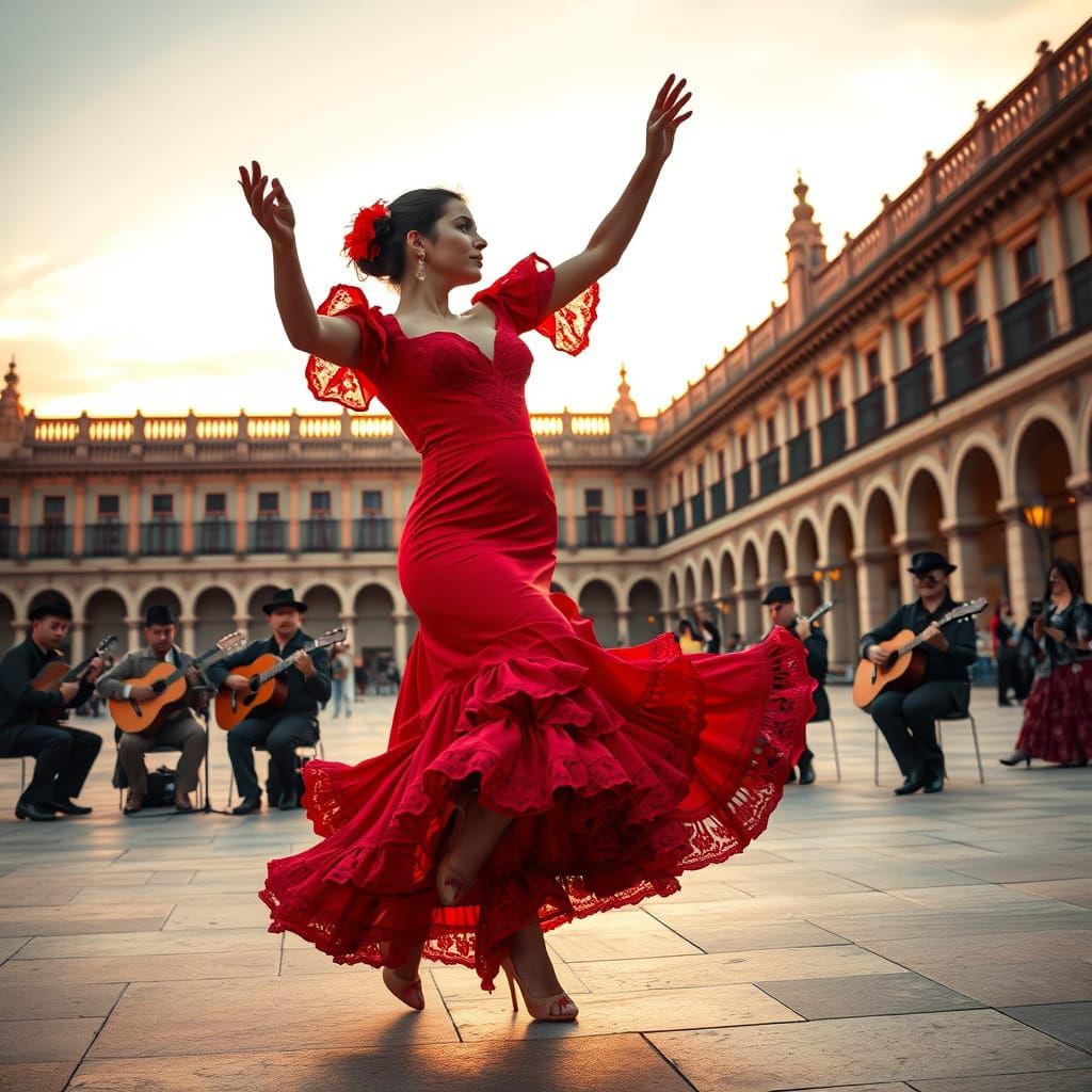 A flamenco dancer in a stunning red dress, adorned with lace and ruffles, executes a passionate dance on the grand Plaza de España in Seville, surrounded by majestic architecture and musicians playing Spanish guitar.