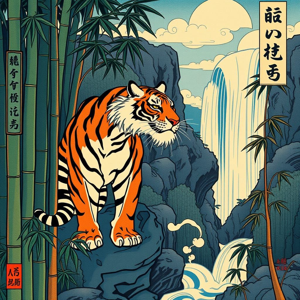 This image shows a majestic tiger in a bamboo forest with a waterfall. The artwork is in the style of a Japanese ukiyo-e woodblock print with vivid colors and bold outlines.