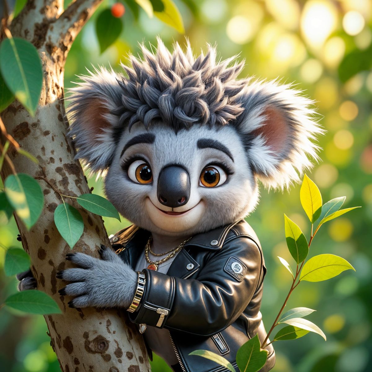 This image shows a happy koala in a punk rock outfit, hugging a eucalyptus tree. The koala's grey afro and punk earrings add a playful touch.