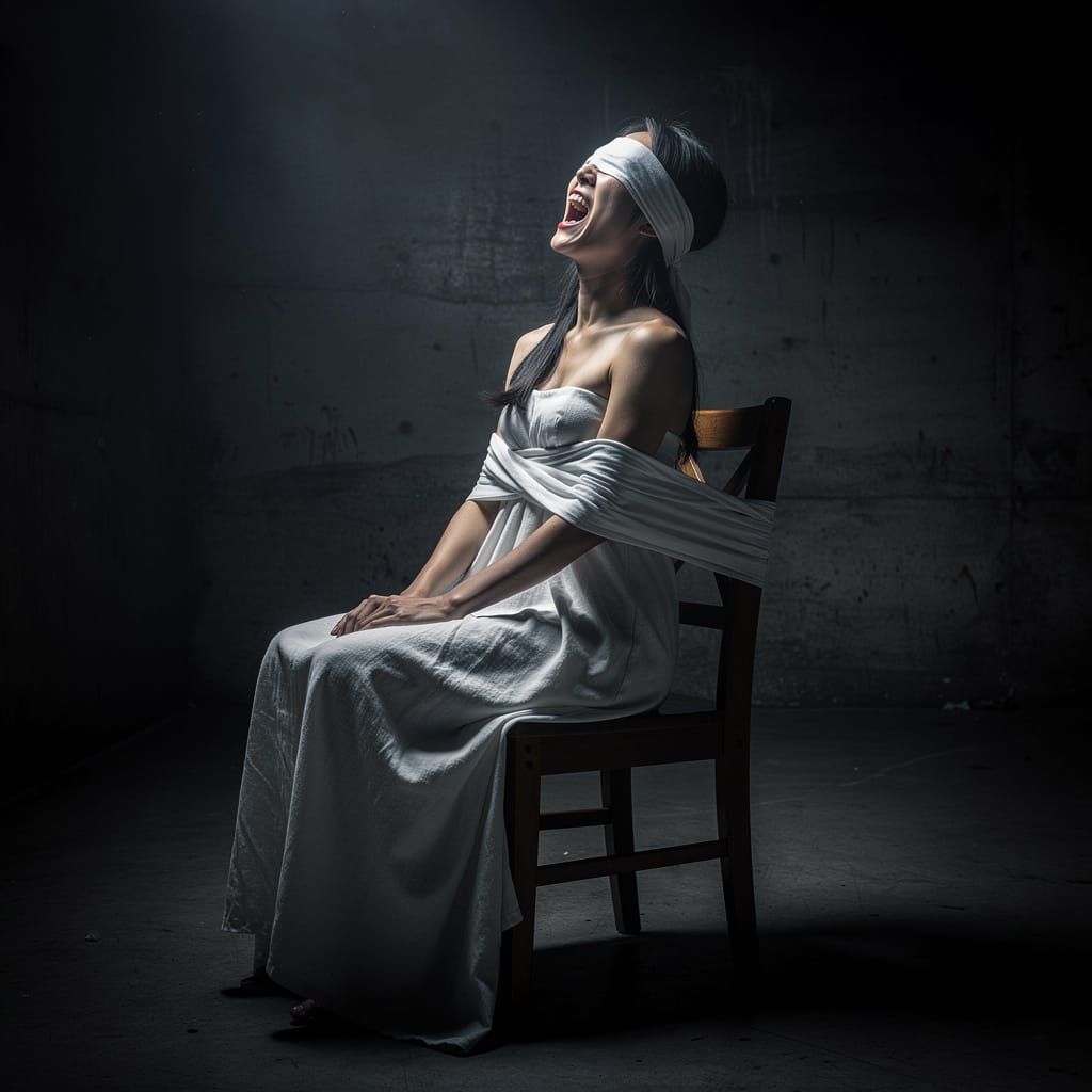 This hyperrealistic photograph captures a woman in intense agony and distress, tied to a chair in a dark, oppressive setting. Dramatic chiaroscuro lighting emphasizes her suffering, evoking psychological horror.