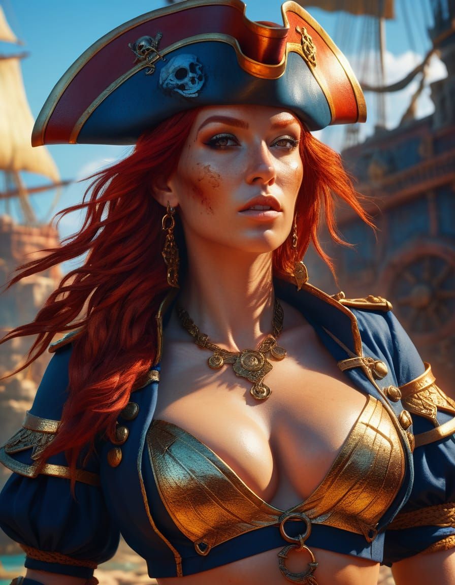 This image is a stunning digital painting of a red-haired pirate in a bikini-style uniform, set against a backdrop of vibrant blue ruins and illuminated by golden hour lighting, showcasing intricate detail and deep color.