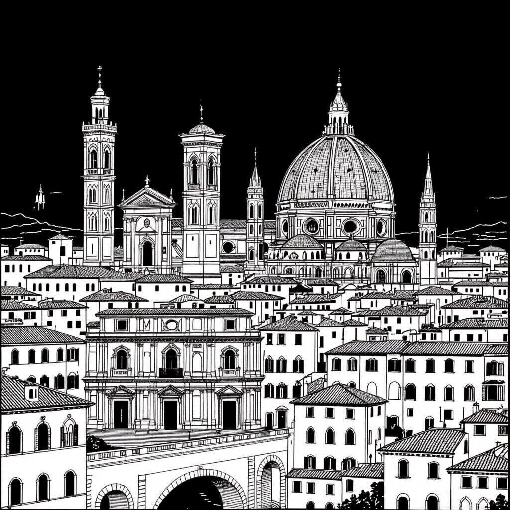 This image presents a minimalist black and white line drawing of a cityscape with Italian Renaissance architecture. It features clean lines and focuses on architectural forms, inspired by classical etching styles.