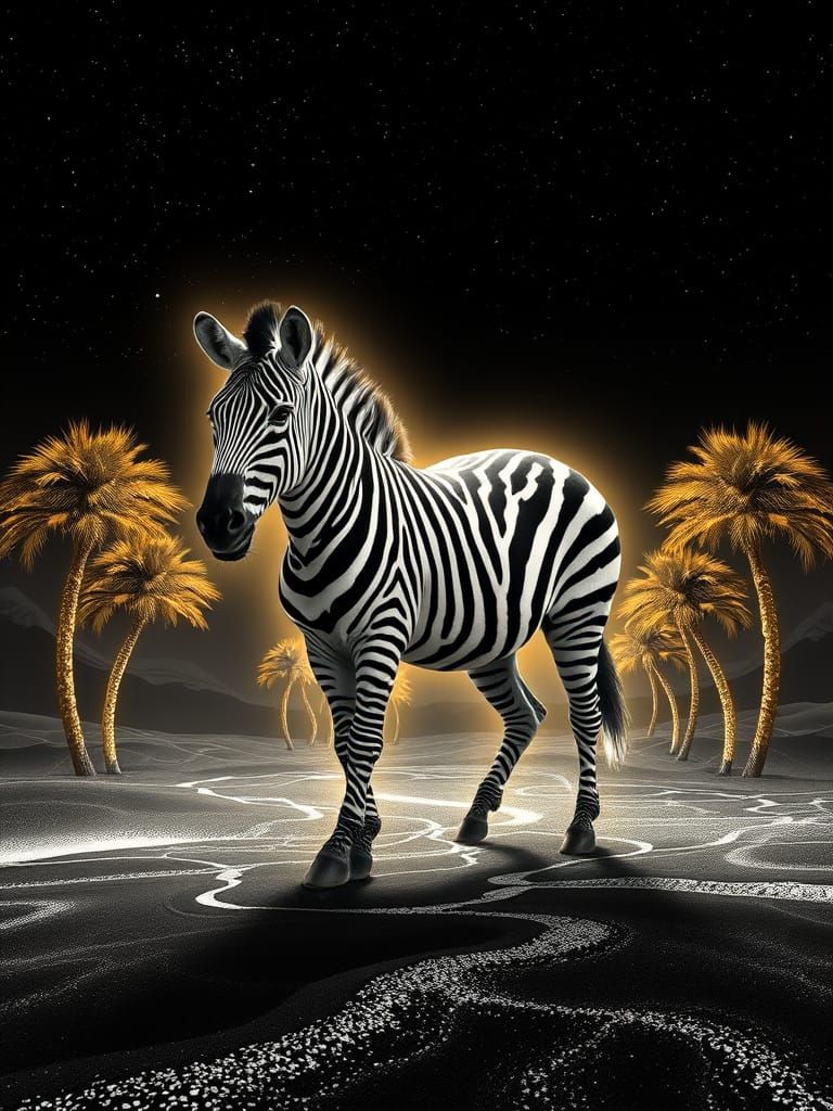 A healthy zebra in a black crystalline desert oasis, adorned with glowing fractal auras. Features liquid black sands and zebra-patterned palm trees. Rendered with high contrast and bioluminescent details.