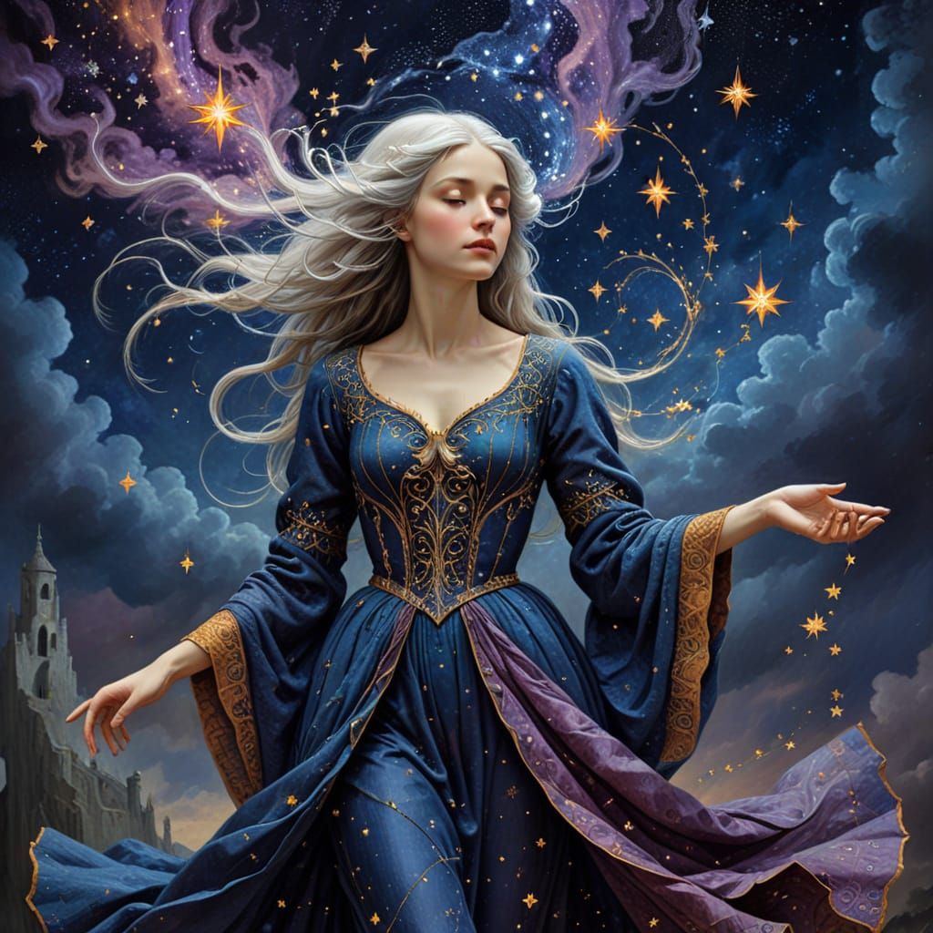 A beautiful woman with flowing, starlit white hair is depicted as a living constellation, her form outlined by shimmering celestial bodies ...