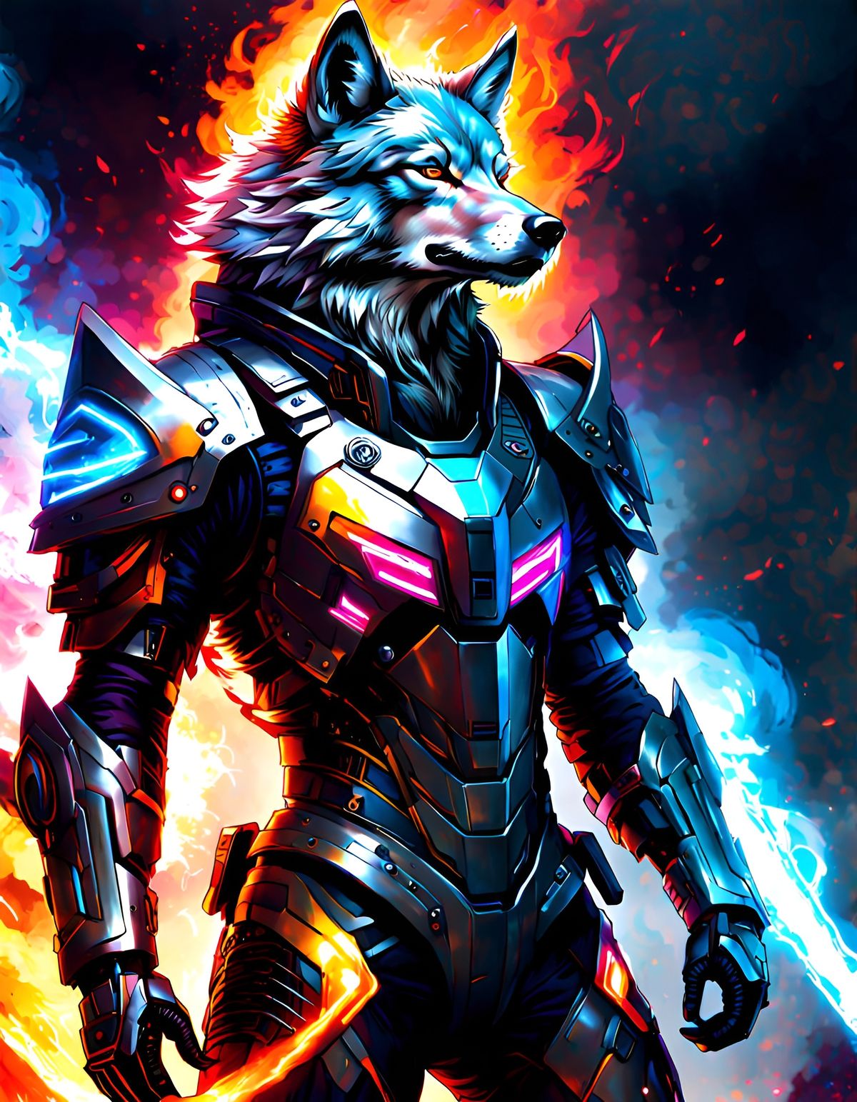 A vivid comicbook-style image of an anthropomorphic wolf warrior. The wolf is clad in futuristic cybernetic armor, posed dynamically against a backdrop of dusk and fire in a chromatic anime style.