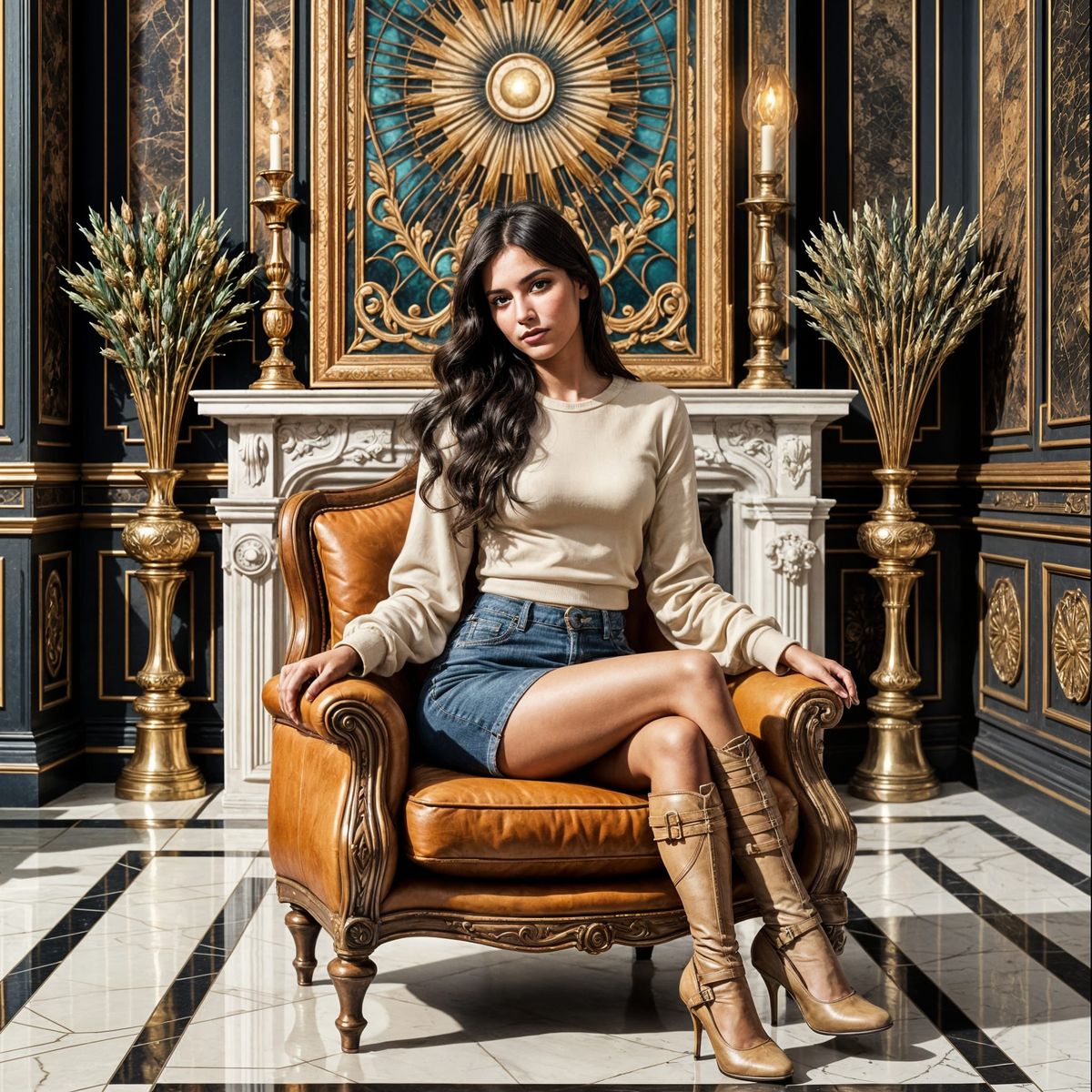 A woman of Mediterranean descent with olive skin and dark hair sits in a leather armchair, wearing stylish boots and a denim skirt. The opulent setting features marble and stained glass.