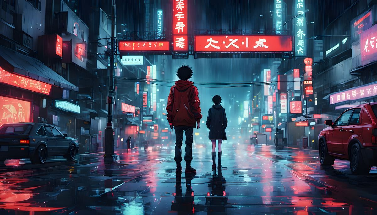 This image shows Akira in a detailed anime scene with neon lights on a rainy day. The artwork features deep colors, intricate details, and cinematic lighting in a cel-shaded style.