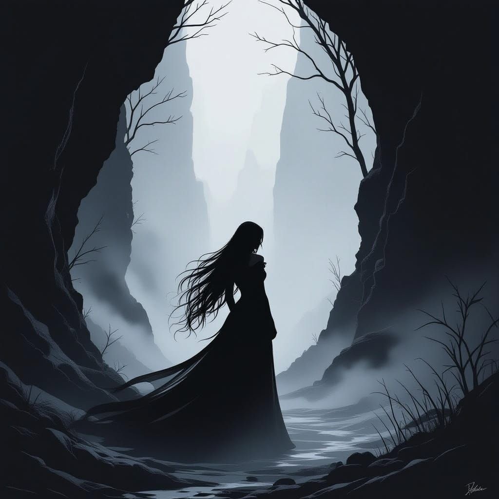 This image showcases a woman with long black hair and black attire, silhouetted against a black nature backdrop. It uses dramatic lighting and deep shadows for a hauntingly beautiful effect, reminiscent of moody romanticism and dark fantasy art.