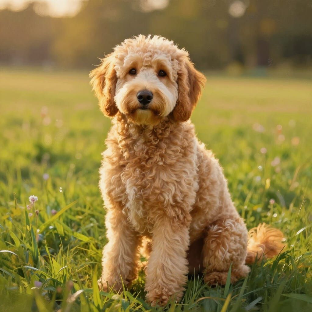 This image shows a fluffy golden doodle dog on a green meadow during golden hour. The scene is depicted in a vibrant, painterly style with soft brushstrokes, capturing natural light and color.