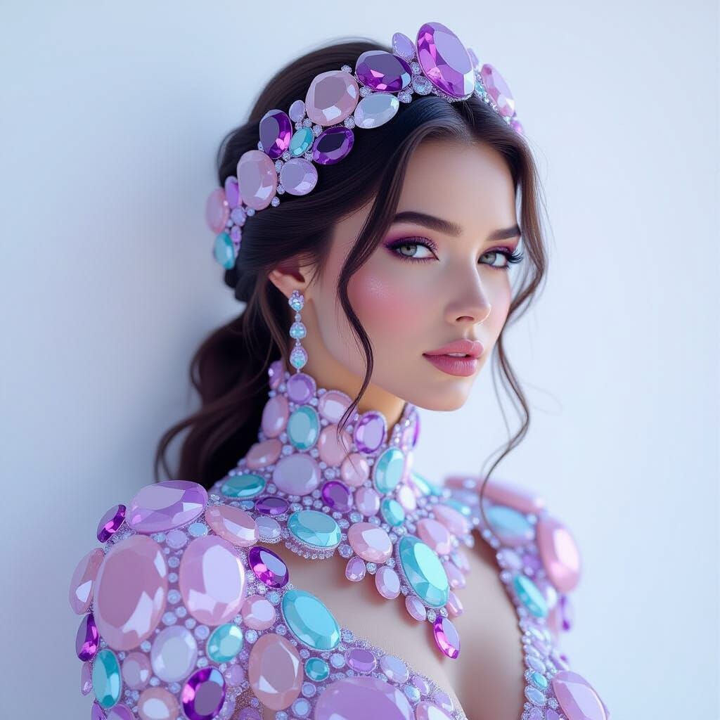 This image shows a delicate female silhouette formed from luminous lavender, turquoise, and rose quartz stones. Soft, diffused lighting enhances the futuristic, elegant digital art style.