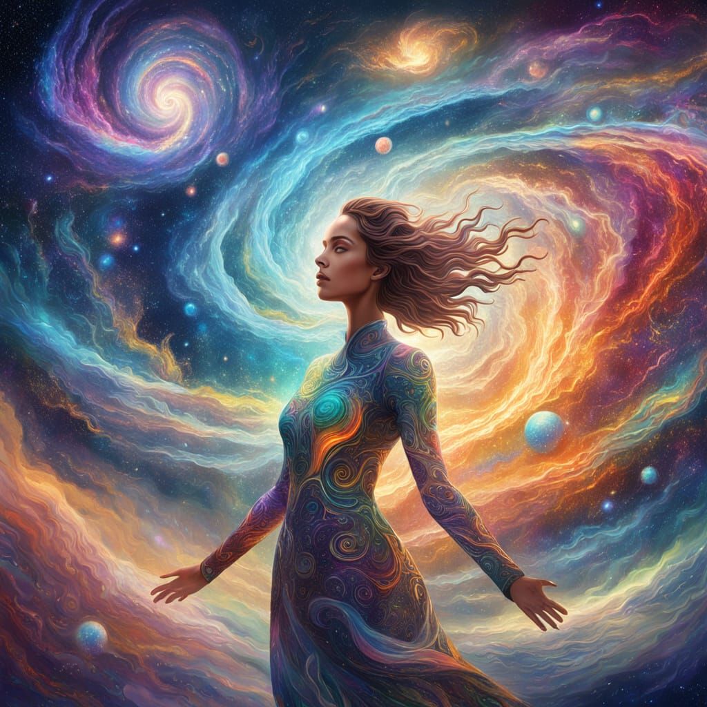 A holographic astral illustration of an angel woman within the vastness of the universe, rendered in mixed media with 8k resolution.