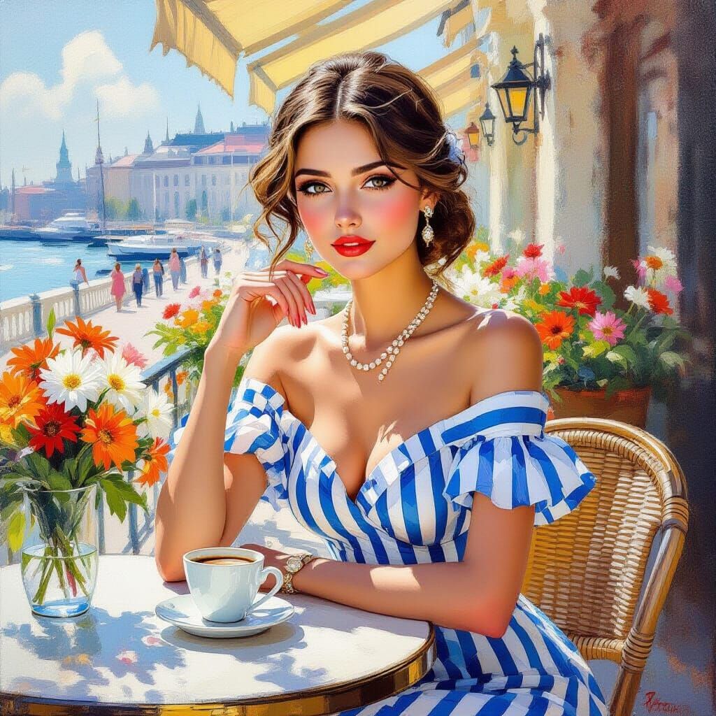 A portrait of a Russian woman at an outdoor cafe. She wears a blue and white dress and sits with coffee and flowers on a summer day, reminiscent of impressionist oil paintings.