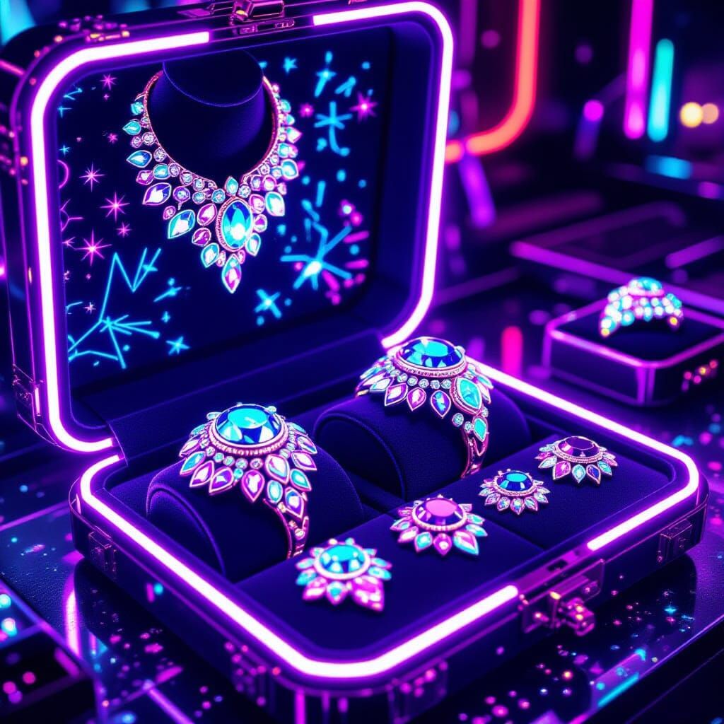 A vibrant image showcases glittering jewelry with intricate details displayed in a neon-lit case. The futuristic aesthetic is reminiscent of Tokyo street style, rendered as digital art.