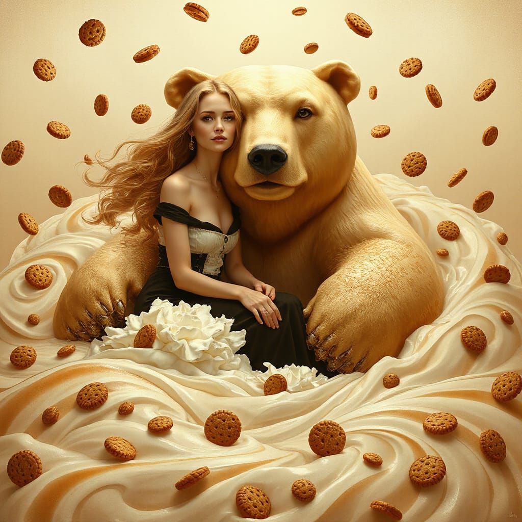 A serene woman with golden hair sits by a colossal cappuccino bear in a dreamy sea of foam, with cookies floating. Features art nouveau elegance and imaginative realism.