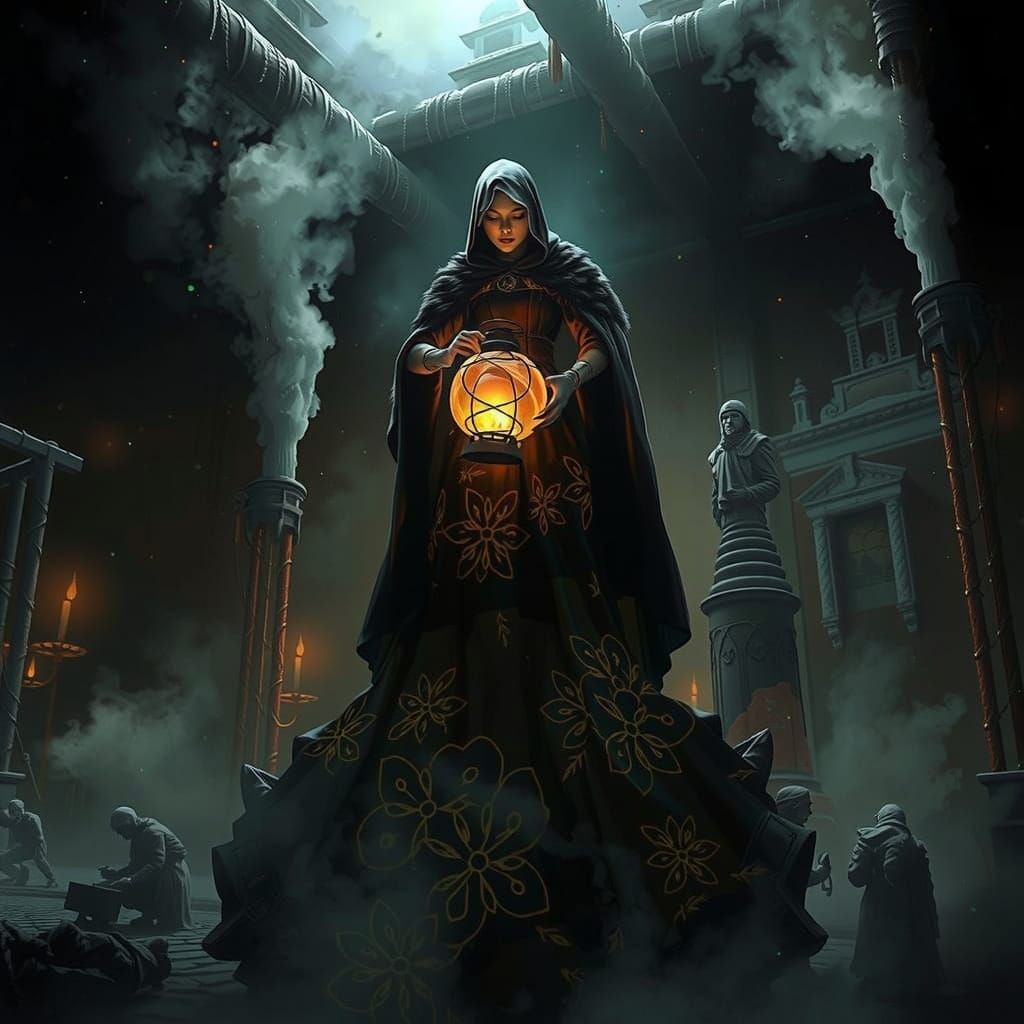 A woman in elegant black attire walks through a snowy Russian landscape, holding a glowing lantern. Bioluminescent patterns on her dress illuminate the snow and trees in a digital matte painting style.