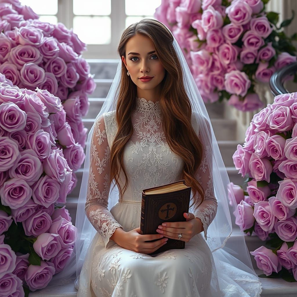 A full shot of a woman in a wedding gown sitting on a marble staircase with roses. She is holding a leather book with a cross design in this detailed, bright and dramatic image.