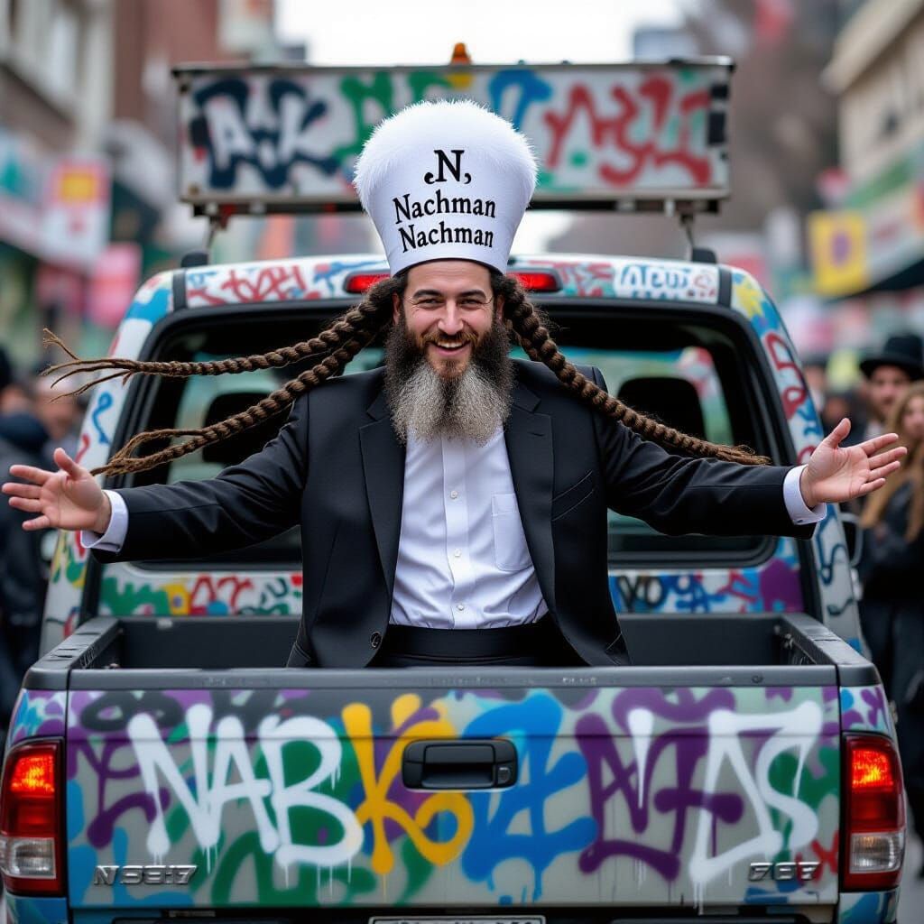 This image portrays an Ultra-Orthodox Jewish man in Haredi attire, sporting a distinctive Nachman kippah inscribed with text. He stands on a graffiti-adorned truck, embodying a lively and spirited celebration of cultural identity.