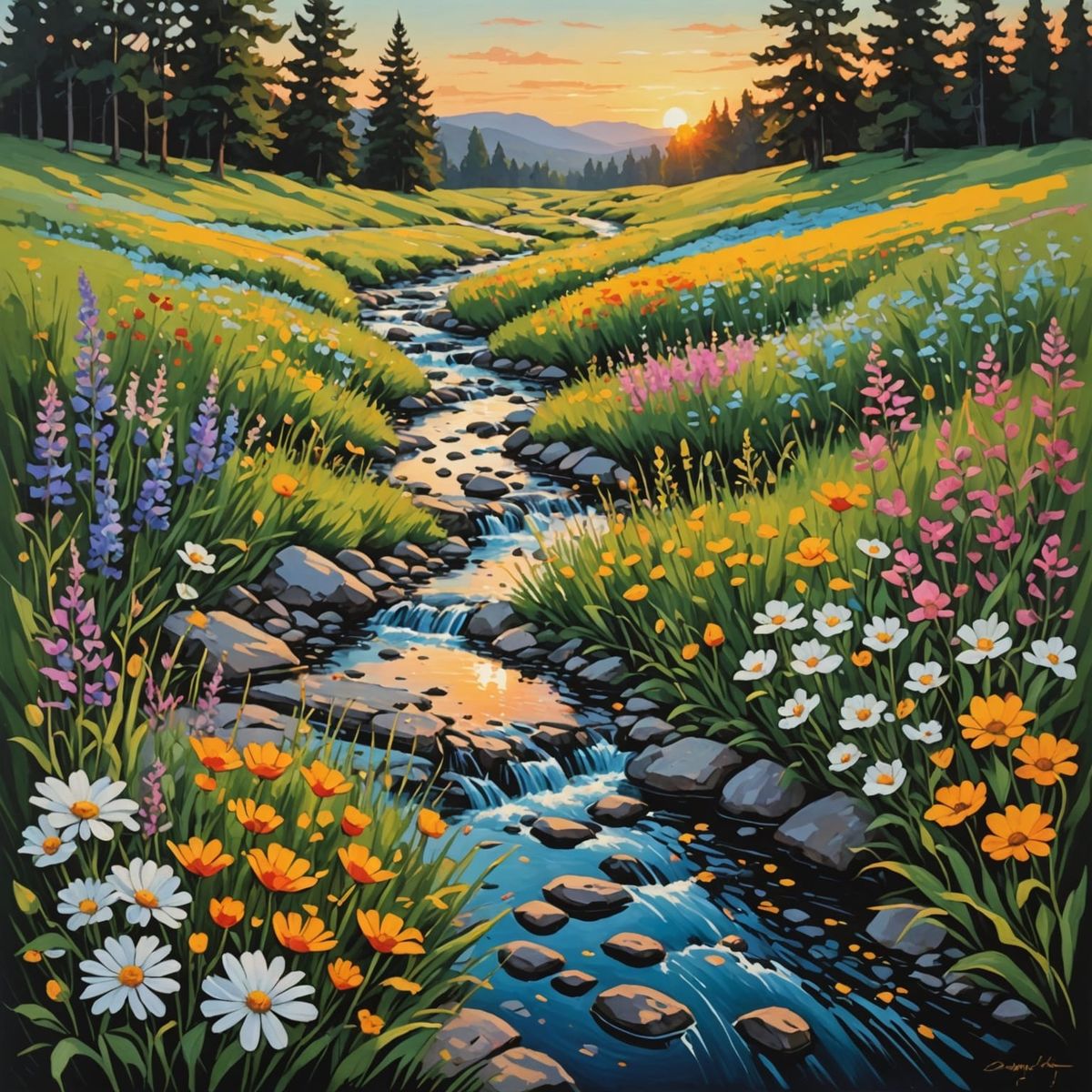 This image captures a meadow filled with flowers beside a stream at sunset, rendered in a detailed abstract art style with complementary colors.