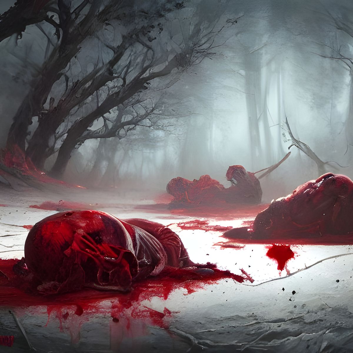 This image shows a sea of blood and dismembered corpses under dark trees. The scene is rendered in an ethereal, hyperdetailed style with astral and cosmic elements, reminiscent of a detailed matte painting.