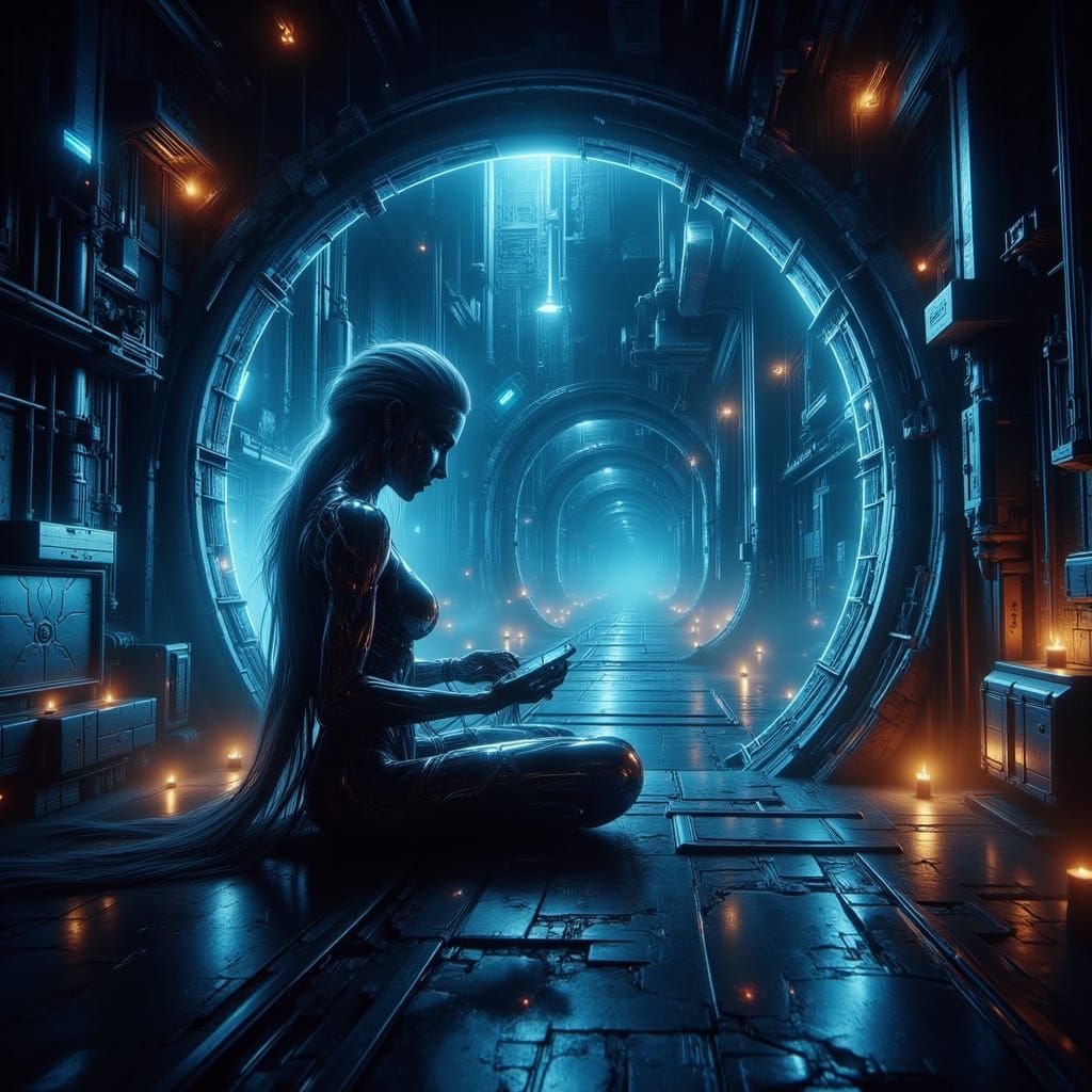 This image depicts a female robot engaged in detailed work within an expansive, dimly lit spaceship. The art style features smooth lines and sharp details, with atmospheric lighting.