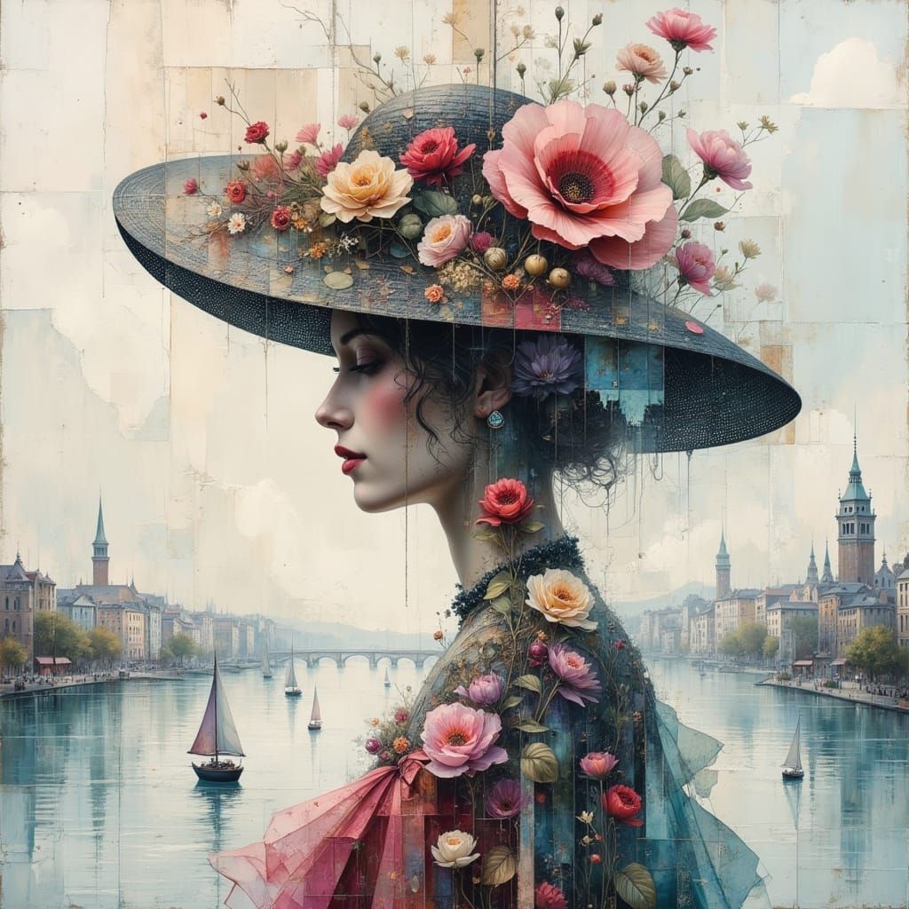 A striking picture of a woman with a cityscape hat overlooking a lake. The artwork features a double exposure effect and an abstract, surreal aesthetic with cozy pastel colors.