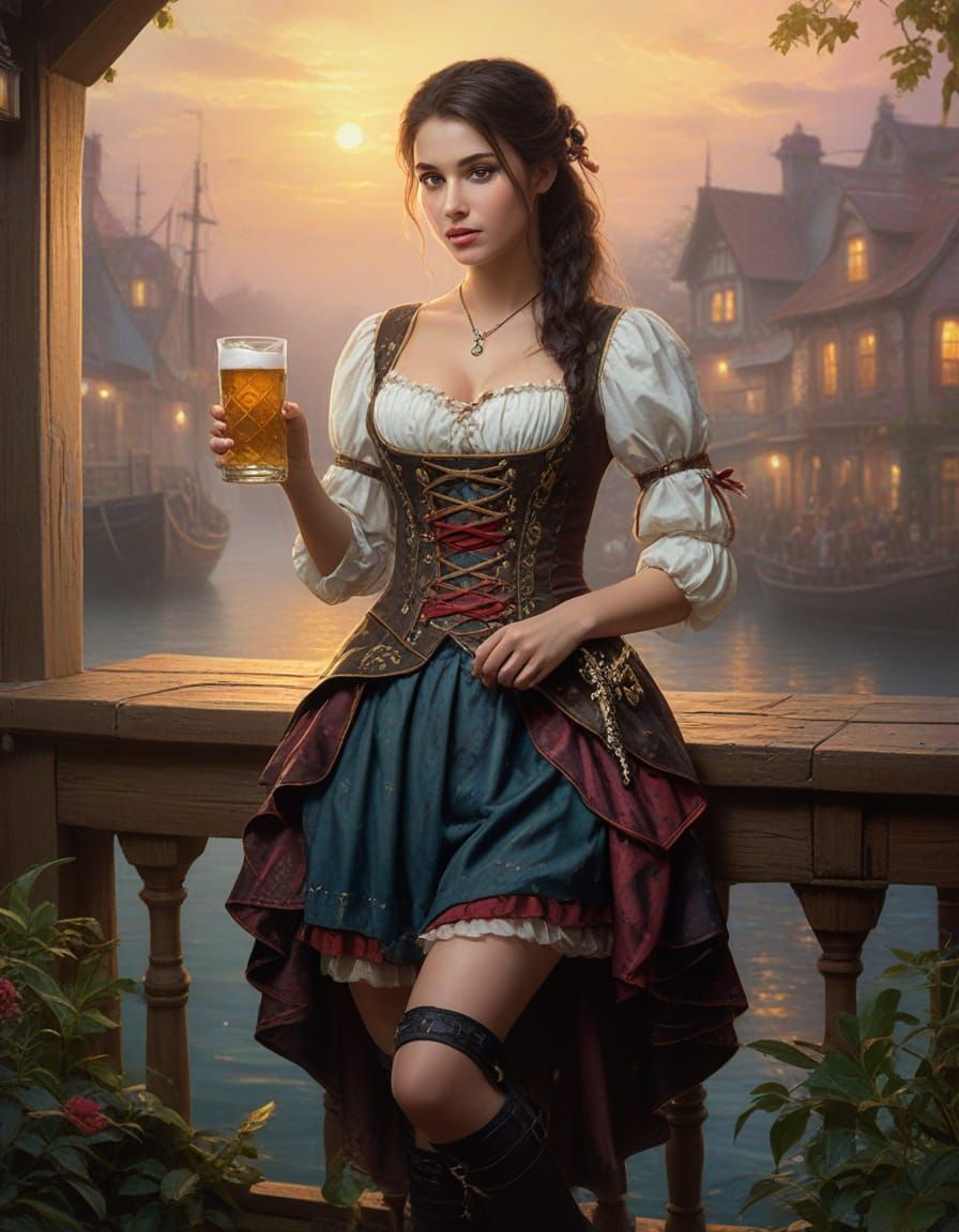 A full view of a beautiful female pirate in a tavern, holding a beer. This fantasy art piece features a misty atmosphere, soft golden lighting, and vibrant colors, rendered with a dreamy ambiance.