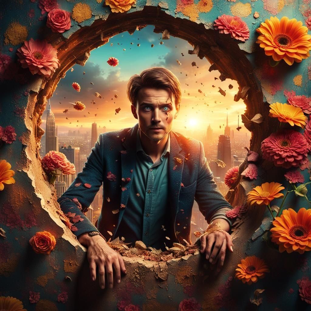 "A creepy guy with big eyes looking through a hole in the wall with flower wall paper. His hands pull the hole apart."